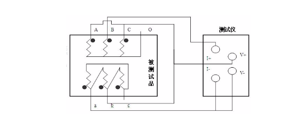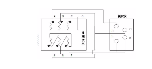 關(guān)于大容量的變壓器的低壓側(cè)丈量時(shí),如果在既有的情況下,直流電阻測驗(yàn)儀的最大電流比較小,或許為了加速丈量速度,可挑選助磁法丈量。圖三、圖四分別為丈量低壓Rac、Rba、Rcb的接線辦法。