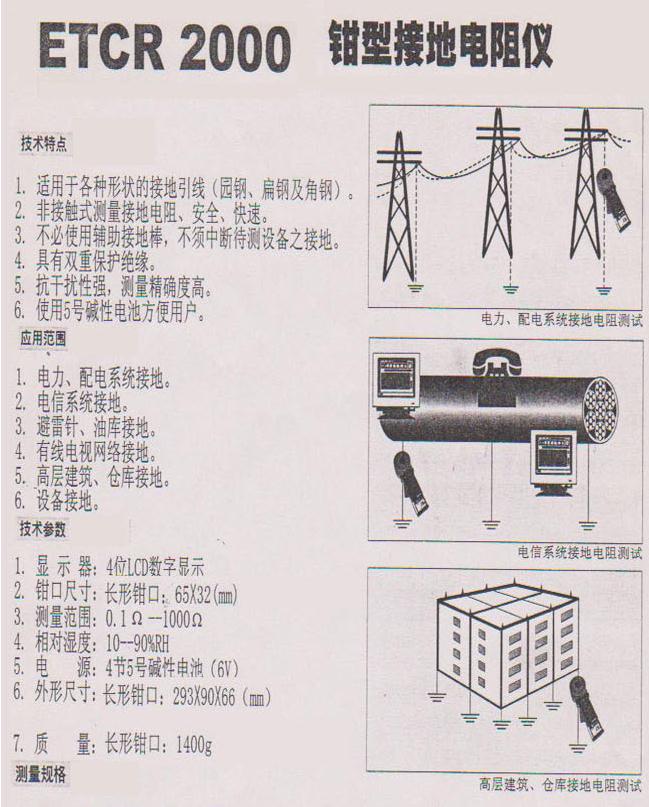 ETCR2000型鉗形接地電阻測(cè)試儀是傳統(tǒng)接地電阻測(cè)量技術(shù)的重大突破,廣泛應(yīng)用于電力、電信、氣象、油田、建筑及工業(yè)電氣設(shè)備的接地電阻測(cè)量。