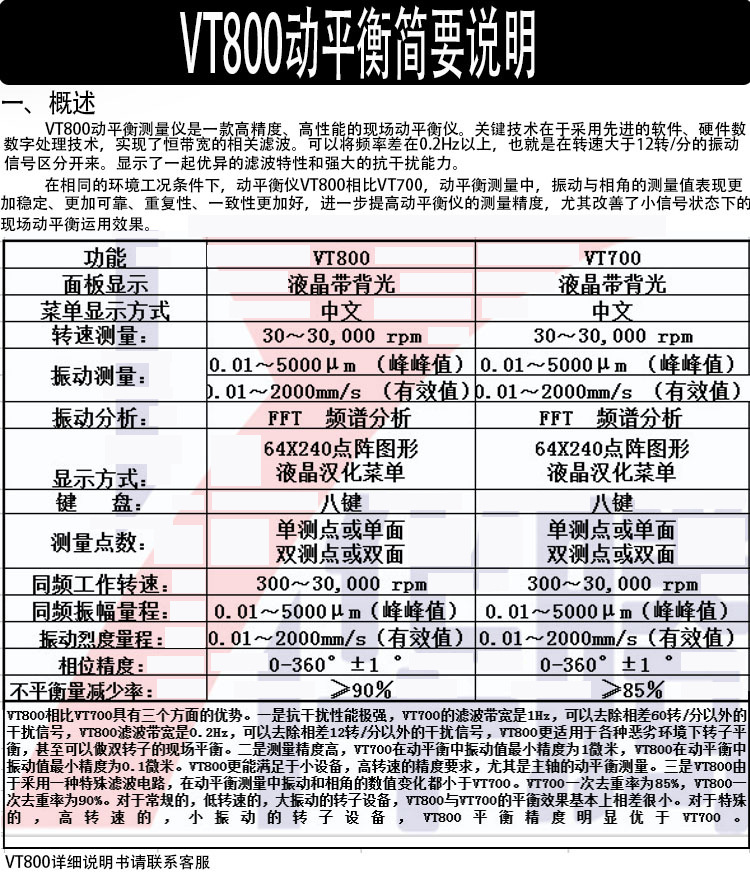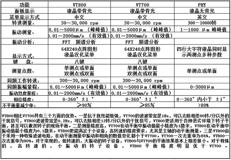 7. VT700動(dòng)平衡測(cè)量?jī)x與PHY動(dòng)平衡測(cè)量?jī)x的區(qū)別,VT700屏幕中文顯示,PHY屏幕英文顯示,VT700液晶帶背光圖文顯示比PHY清晰,利于一般工人操作。VT700測(cè)量精度比PHY精度高。PHY可以交直流兩用,VT700只能用交流電。PHY一幅顯示A.B二面參數(shù),VT700二幅顯示A.B二面參數(shù)。PHY具有配重向左右選定角度計(jì)算能力,適用葉輪動(dòng)平衡計(jì)算。VT700可以對(duì)有差轉(zhuǎn)速?gòu)?fù)合旋轉(zhuǎn)體進(jìn)行動(dòng)平衡,VT700的選頻性能優(yōu)于PHY。